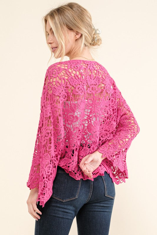 Beautiful You Fuchsia Crochet Front Tie Bell Sleeve Cardigan